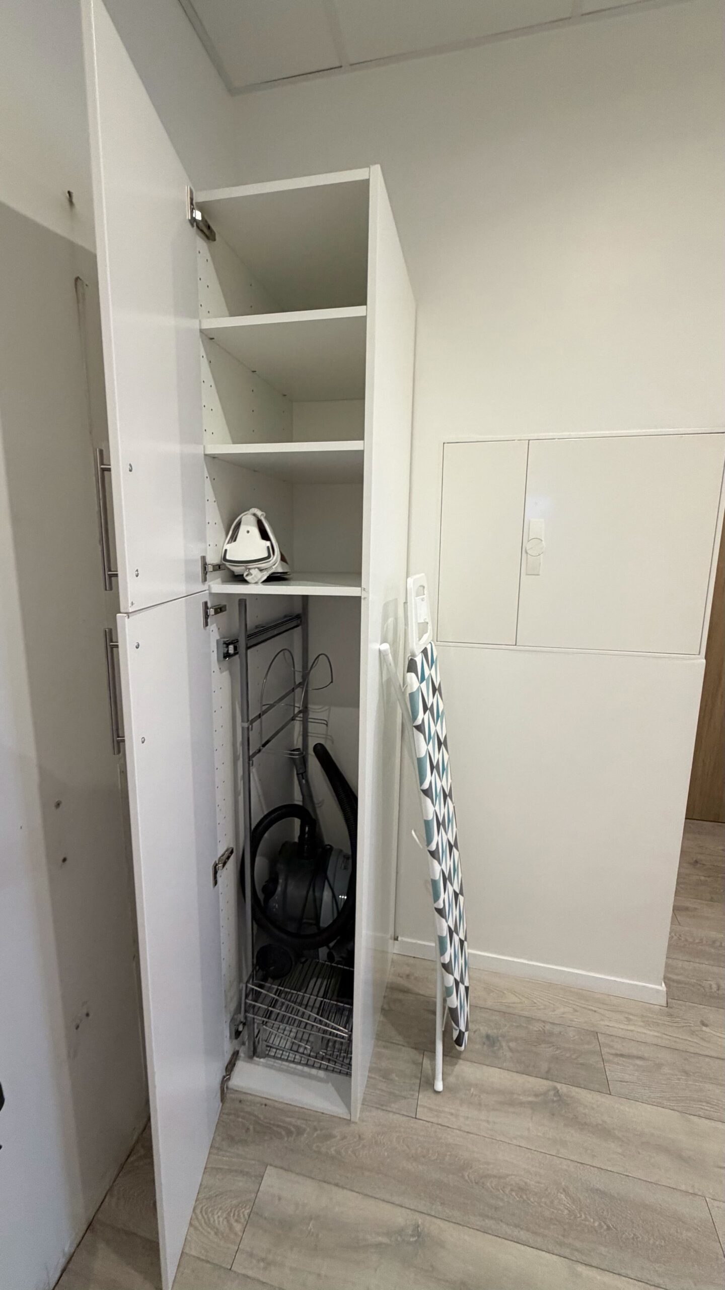 If you need an iron with an ironing board or a vacuum cleaner, these are available in the white cabinet on each floor.