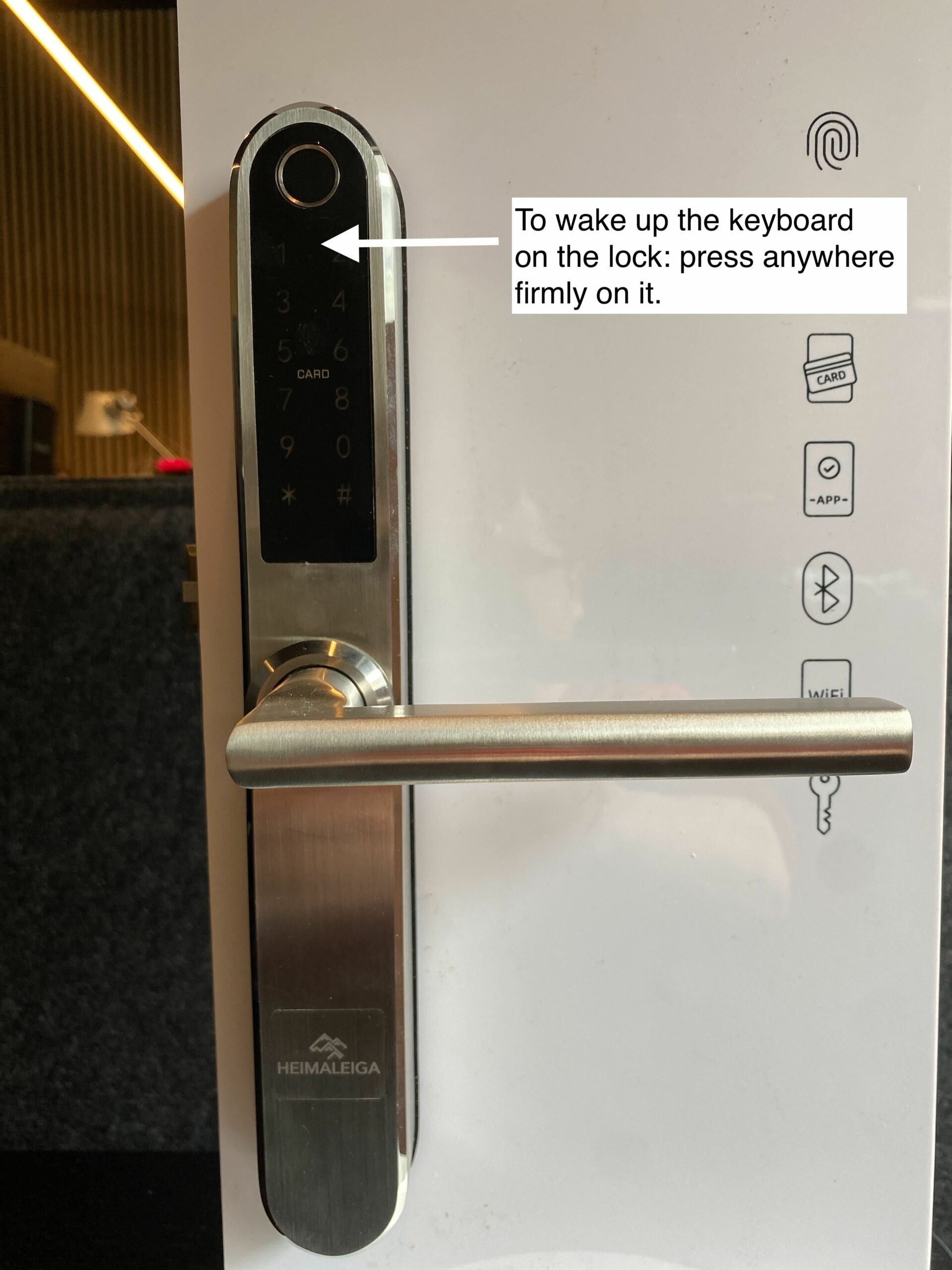To wake up the keyboard on the lock press anywhere firmly on it.