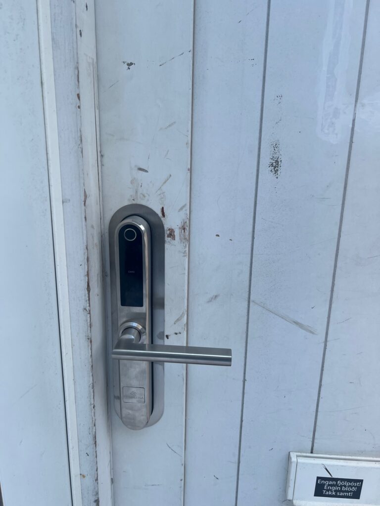 Ránargata 10A is a white house, behind the blue house number 10. You need to walk into the alley between the blue house nr 10 and 12 and you’ll find a small house to your right where your apartment is.